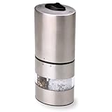 Olde Thompson Combo Peppermill and Salt Grinder all in one unit. Battery opeprated, unique contemporary design allows the user to grind both pepper and salt with sliding push botton control.Cabon steel grinding mechanism in peppermill and ceramic grinder for salt.Comes filled with sat and pepper. Measures 6-inch high.Stainless construction. Requires 6 AAA batteries.