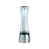 PEUGEOT: France, since 1810.Peugeot mills are renowned by chefs and gourmet cooks the word over for the consistent grind results they produce, their incredible resilience and proven reliability.Compromise is not a word that fits into the Peugeot vocabulary.For each spice, there is one - and only one - Peugeot grinding mechanism: peppercorns; coarse dry salt; chilies; herbs and spices; wet salts; and nutmeg.Add the coffee mechanism, which started it all, and there are seven unique Peugeot mechanisms.Each is designed to derive the most flavor and greatest aroma from its complementary spice.Aesthetically pleasing, Peugeot mills deliver the height of quality, durability, reliability and innovation; making these mills the ones to which all others are compared. Daman: a classic pairing of crystal clear acrylic and stainless steel combine to reveal Peugeot's latest innovation: its shaftless design takes grinding excellence to a new level of convenience!With the removal of the center shaft, the top knob has now been replaced with a magnetized stopper.This provides the double benefit of greater spice capacity and easier refilling.Daman features Peugeot's exclusive u'Select grind adjustment system, which allows the grind to be adjusted with a simple turn of your wrist!Turn the ring at the bottom of the mill in one direction to make the grind finer; turn in the other direction to make it coarser. Once the grind size is set, it will stay in place until the user changes it. This mill is equipped with Peugeot's exceptional salt grinding mechanism: it is unlike anything else on the market.Its two ribbed plates are made from a stainless steel blend that offers resiliency, rigidity and resistance to corrosion from dry salts.When the mechanism is activated, the ribs work to twist and fracture each salt crystal to the desired size. Mill is 8-1/4-inches tall.