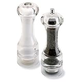 The Mercury Peppermill and Salt Shaker set from Olde Thompson is a classically styled acrylic set that comes filled with the pepper and salt. The set measures 7-Inches tall and the peppermill features a carbon steel grinding mechanism that is fully adjustable from coase to fine.