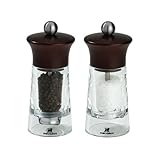 PEUGEOT: France, since 1810.Peugeot mills are renowned by chefs and gourmet cooks the word over for the consistent grind results they produce, their incredible resilience and proven reliability.Compromise is not a word that fits into the Peugeot vocabulary.For each spice, there is one - and only one - Peugeot grinding mechanism: peppercorns; coarse dry salt; chilies; herbs and spices; wet salts; and nutmeg.Add the coffee mechanism, which started it all, and there are seven unique Peugeot mechanisms.Each is designed to derive the most flavor and greatest aroma from its complementary spice.Aesthetically pleasing, Peugeot mills deliver the height of quality, durability, reliability and innovation; making these mills the ones to which all others are compared. Compact, comfortable and attractive, the clear acrylic body of the Vendome is complemented by its beech wood top with a chocolate varnished finish. The grind is adjusted by turning the top nut: turn it clockwise (tighten) for a finer grind; counter-clockwise (loosen) for a coarser grind. The pepper mill is equipped with Peugeot's legendary pepper grinding mechanism. Made of case-hardened steel, it has received additional treatment against wear and corrosion.Its double-row of helix-shaped claws grab and crack each peppercorn, before drawing it down to the teeth for the perfect grind. The salt mill is equipped with Peugeot's exceptional salt grinding mechanism: it is unlike anything else on the market. Its two ribbed plates are made from a stainless steel blend that offers resiliency, rigidity and resistance to corrosion from dry salts. When the mechanism is activated, the ribs work to twist and fracture each salt crystal to the desired size. Set includes 5-1/2-inch salt mill, and 5-1/2-inch pepper mill both with a chocolate varnished finish.