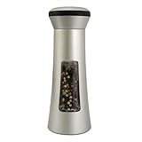 KitchenArt Dual Twist Salt and Pepper Grinder in satin grinds both salt and pepper. Simply twist top clockwise to grind pepper or twist top counterclockwise to grind salt.