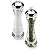 The Tahoe acrylic peppermill and salt shaker set from Olde Thompson features sleek lines with chrome accents. The peppermill features a carbon steel grinding mechanism, and is fully adjustable from coase to fine. Both the mill and shaker come filled with pepper and salt.
