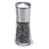 This peppermill from Olde Thomson gets you going right out of the box. It arrives filled with Pepper Supreme, Olde Thompson's unique blend of Tellichery Black, Muntok white, Green, and Pink peppercorns. Constructed from glass with a brushed stainless-steel top, the peppermill features a carbon steel grinding mechanism. It is fully adjustable from coarse to fine. Remove cap for grinding pepper and replace to conceal the mechanism when not in use. This kitchen and dining companion comes backed by a lifetime guarantee.